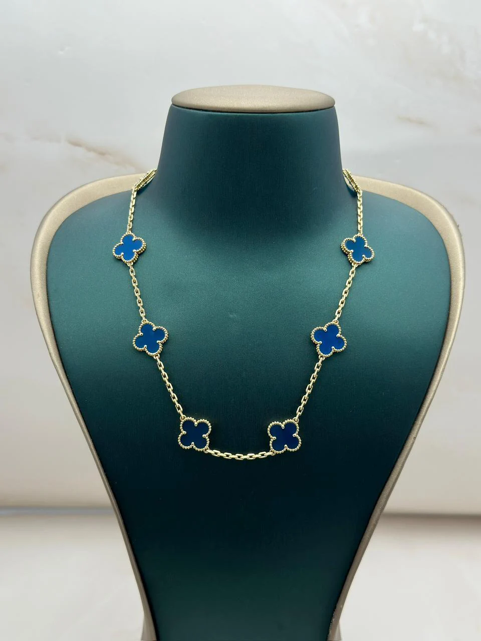 The featured model, crafted in 18k yellow gold with 10 blue agate motifs, delivers everything you expect from an authentic Vintage Alhambra Necklace—grace, craftsmanship, and long-term value.